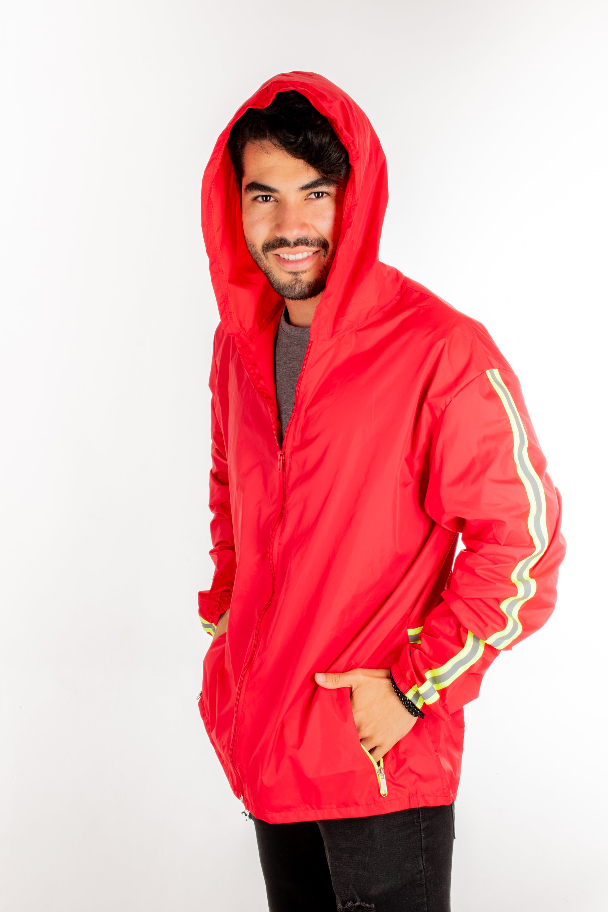 Rompeviento con franjas reflectivas en los brazos y en la espalda, cuenta con bolsillo en la parte inferior de la espalda